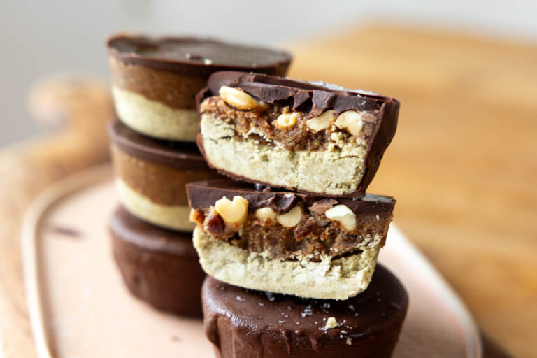 Eine gesunde Alternative zum Klassiker der Kindheitserinnerungen aufkommen lässt. Knuspriger Keksboden, cremiges Karamell und knackige Schokolade feiern ihr veganes und glutenfreies Debüt. Ich liebe es,